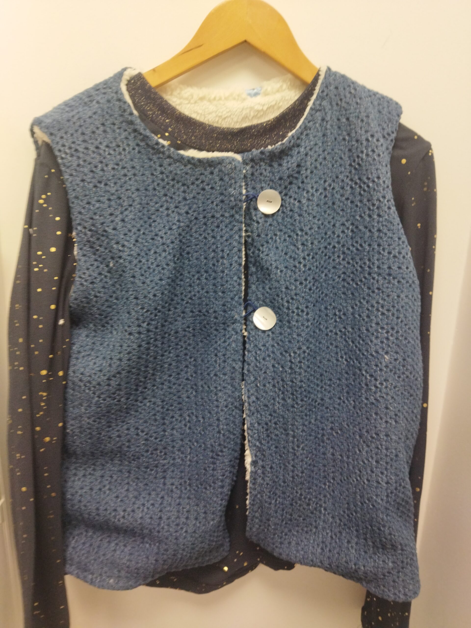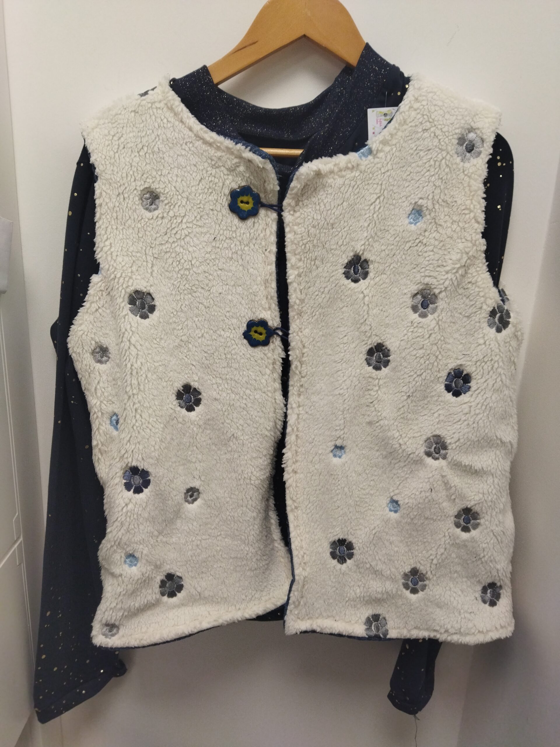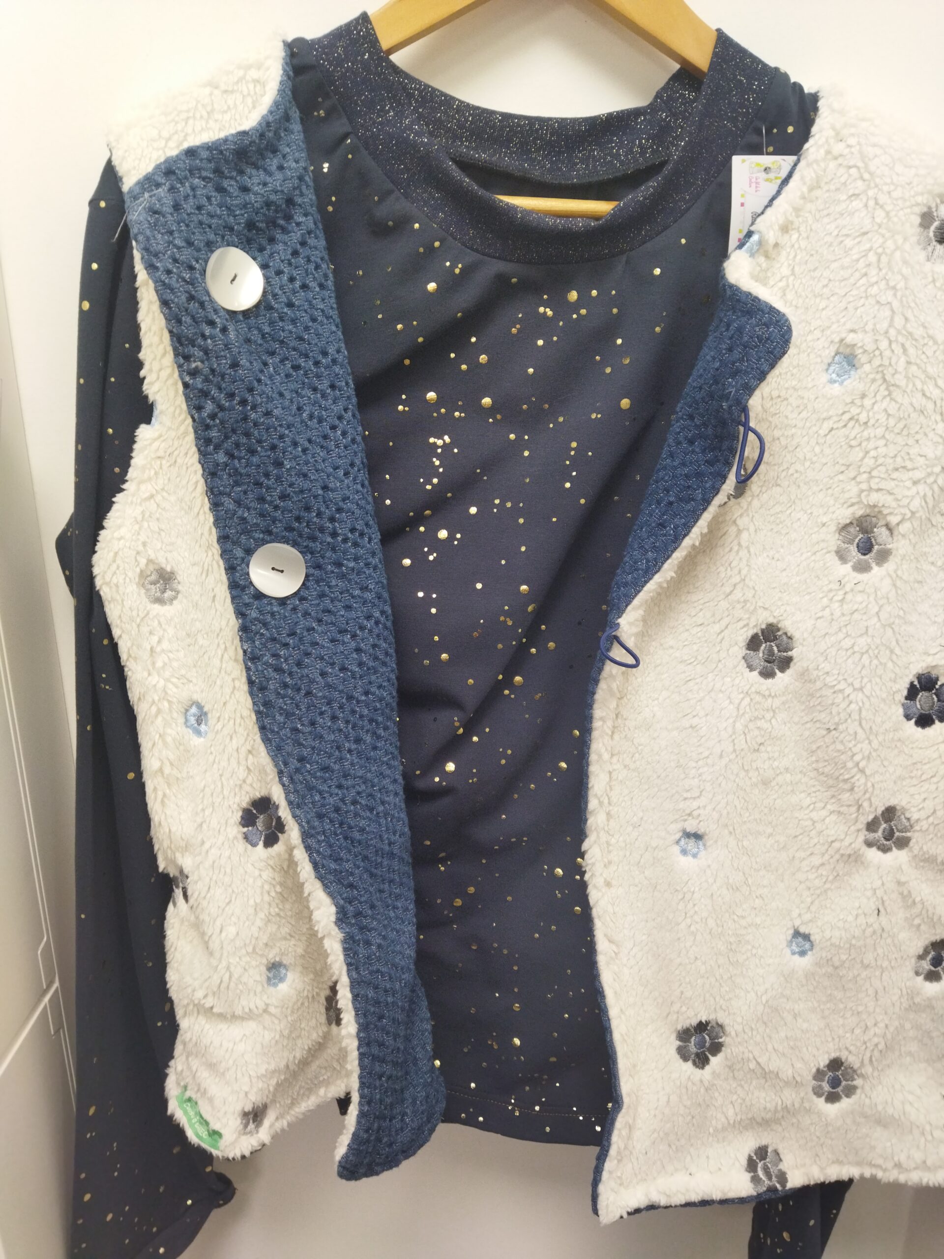 1. Le gilet réversible en sherpa brodé et jean gaufré